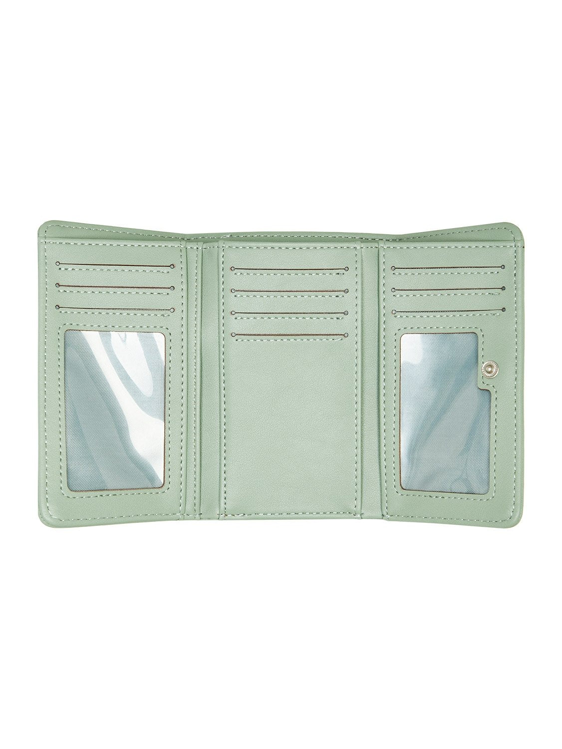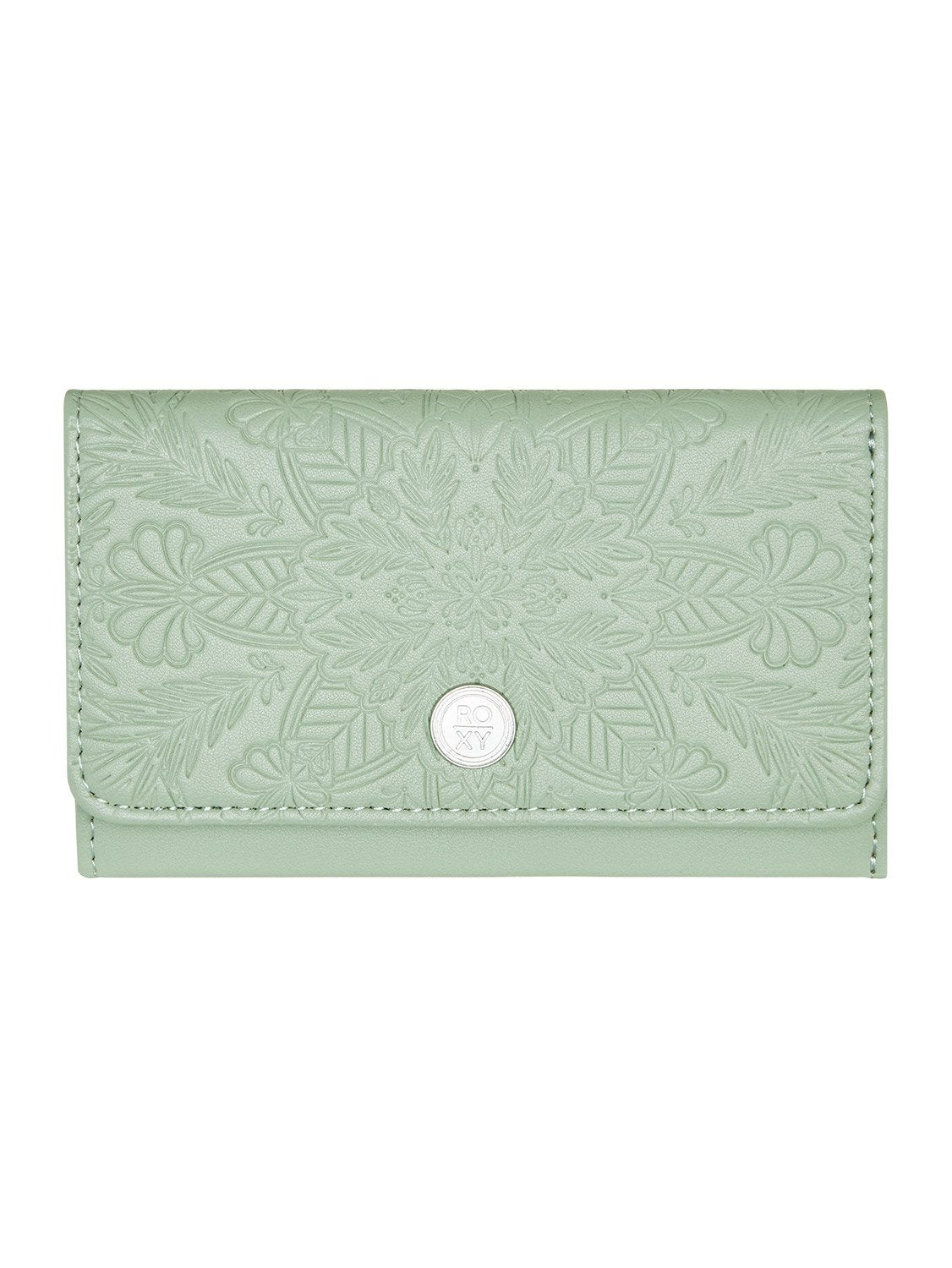 "Type: Tri-fold wallet. Fabric: Textured vegan leather. Pockets/Window: Coin pocket on outside; internal card slots. Roxy metal plate and embossed artwork. Dimensions: 3.5"" (H) x 5.5"" (W) x 1.2"" (D) / 9 (H) x 14 (W) x 3 (D) cm"