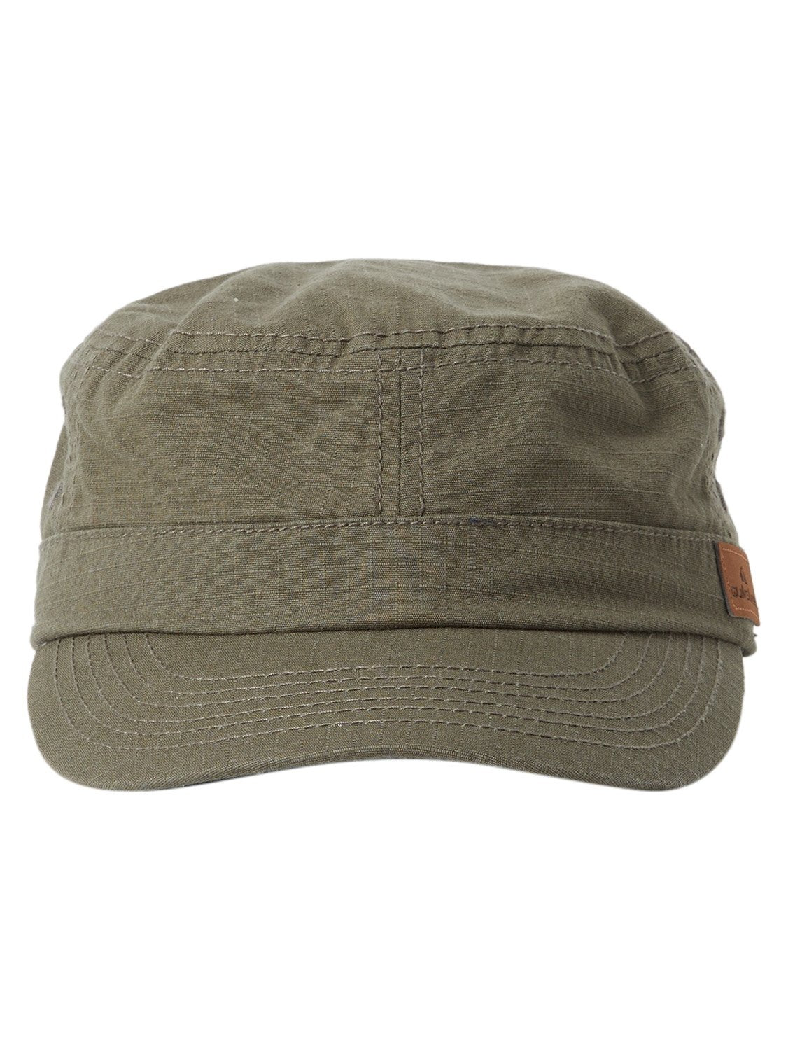 Military Castro Cap. Semi-curved brim. Debossed faux leather patch on side band. Cotton Twill fabric. Self Fabric Closure. 100% Cotton