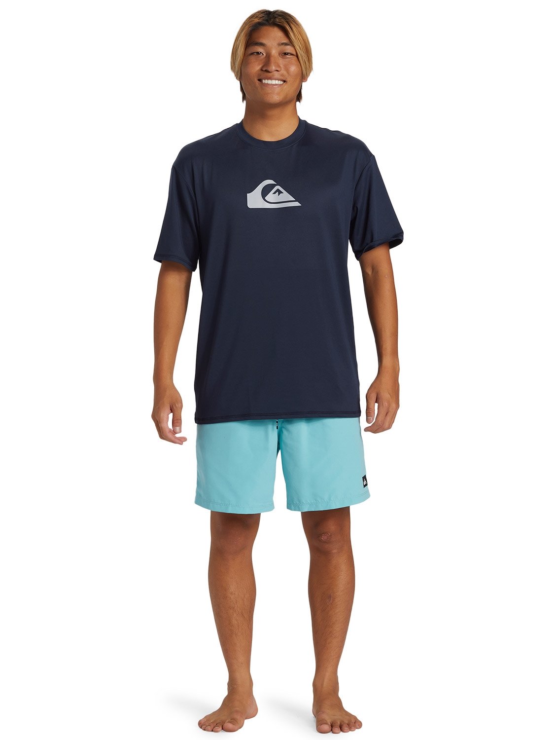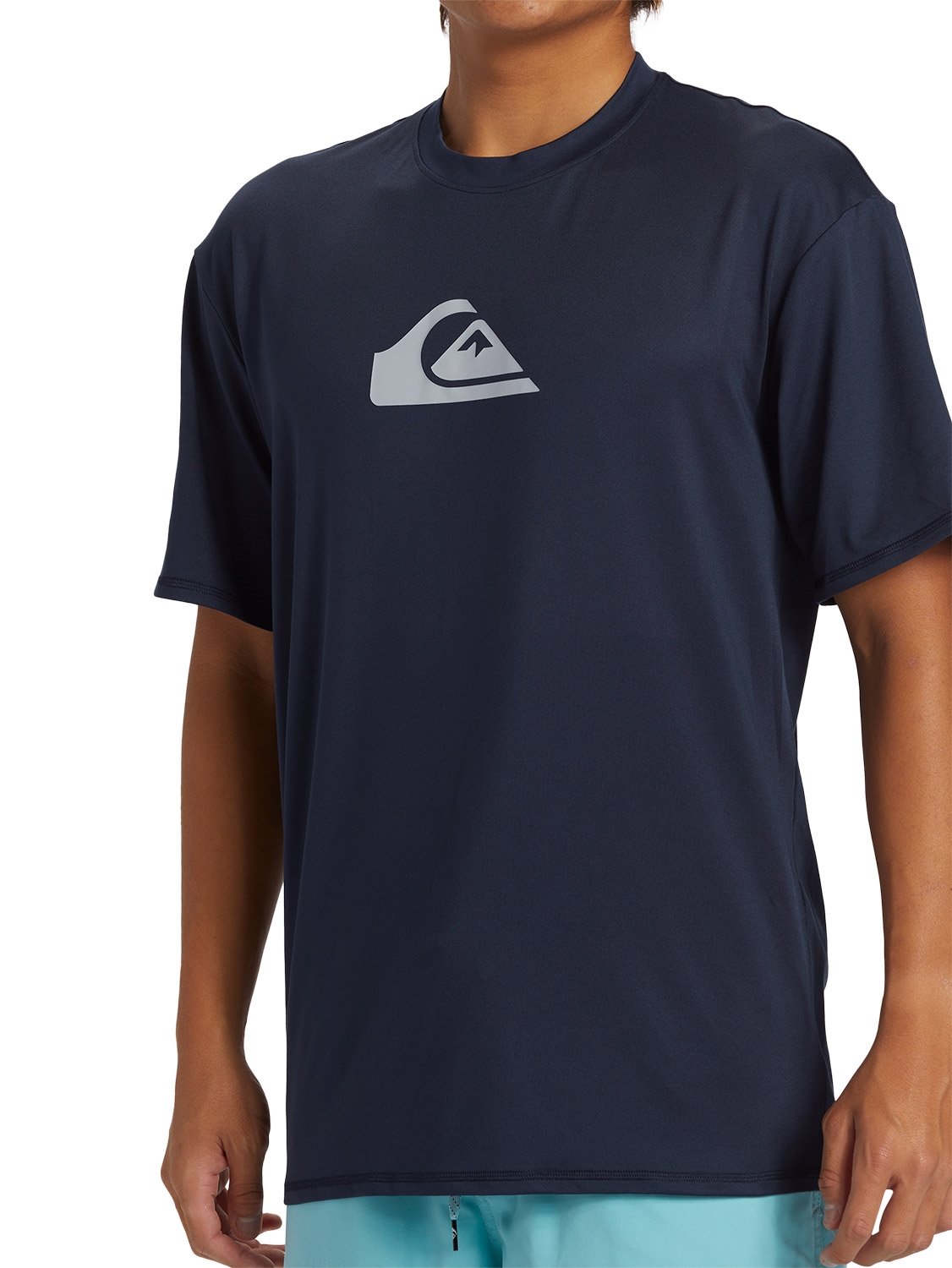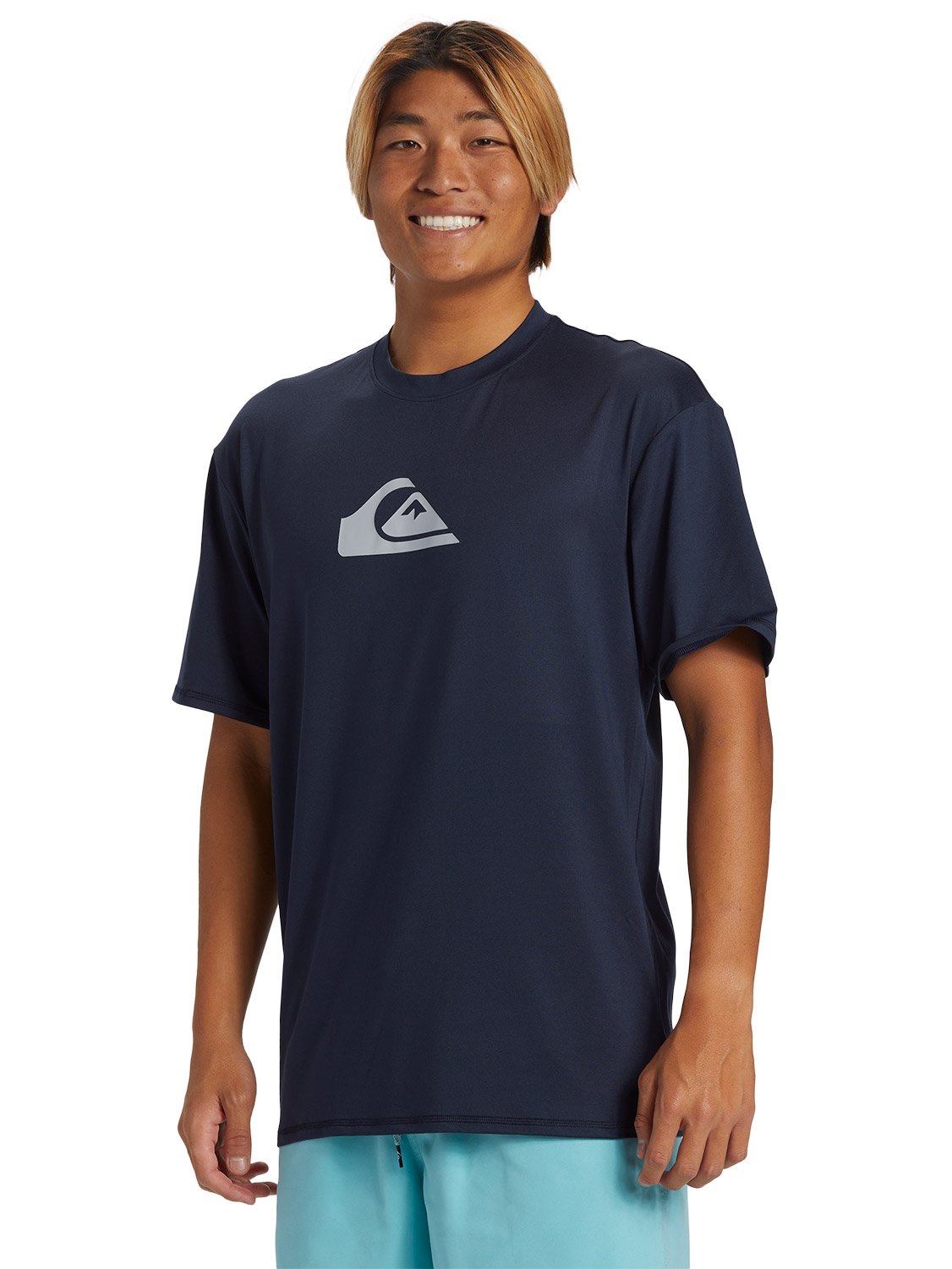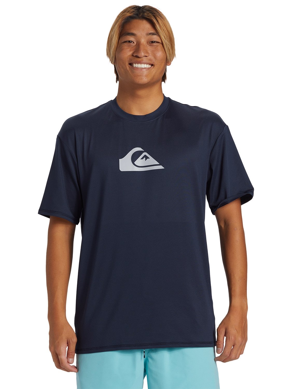 Type: Surf Tee. Fit: Loose. Fabric: Our Cotton-Feel is a fine brushed fabric made with recycled yarn and designed not to stretch out over time . UPF 50+ Sun protection. Chlorine Resistant. Moisture Wicking. Solution Dyed (Black)
