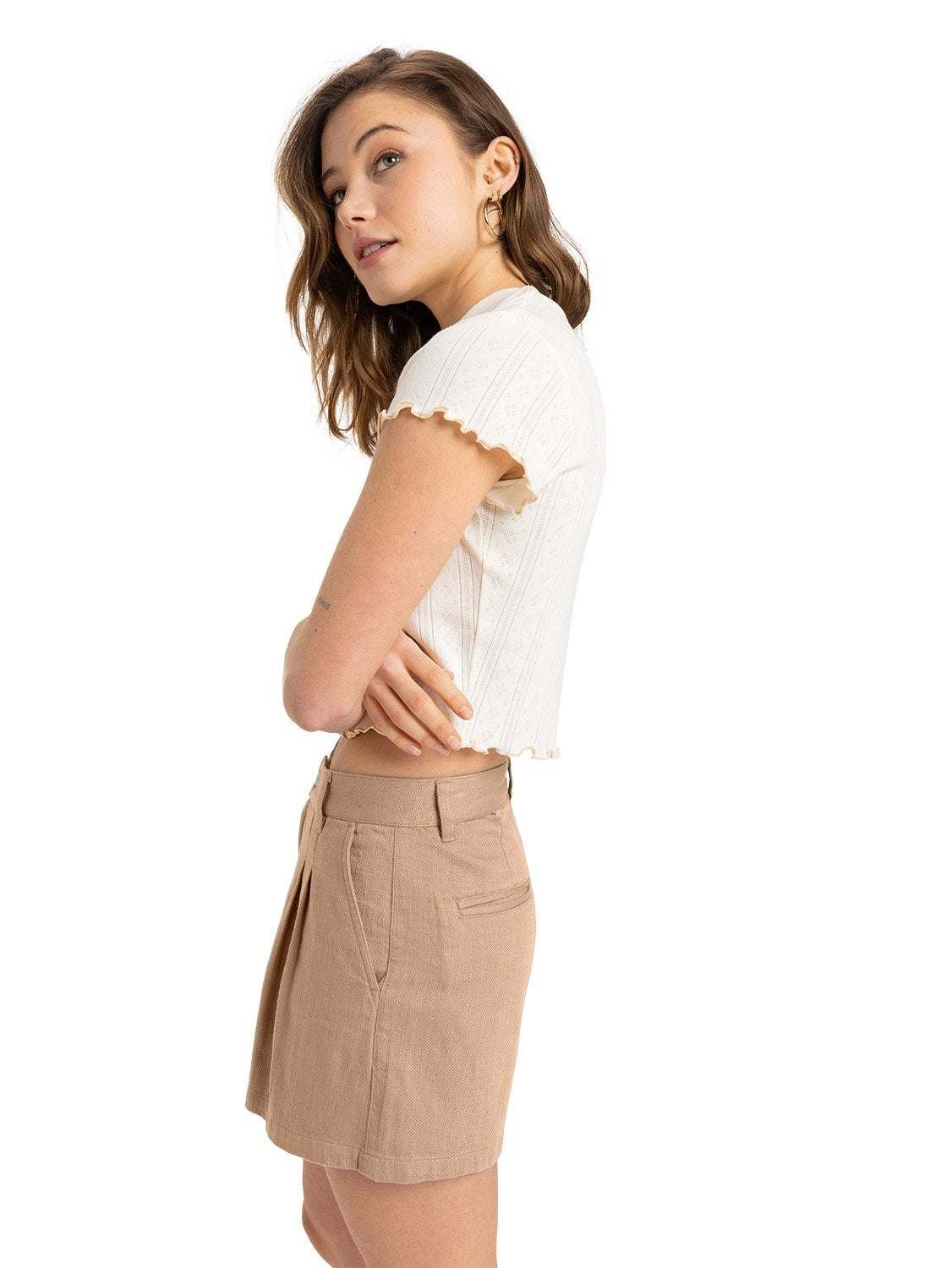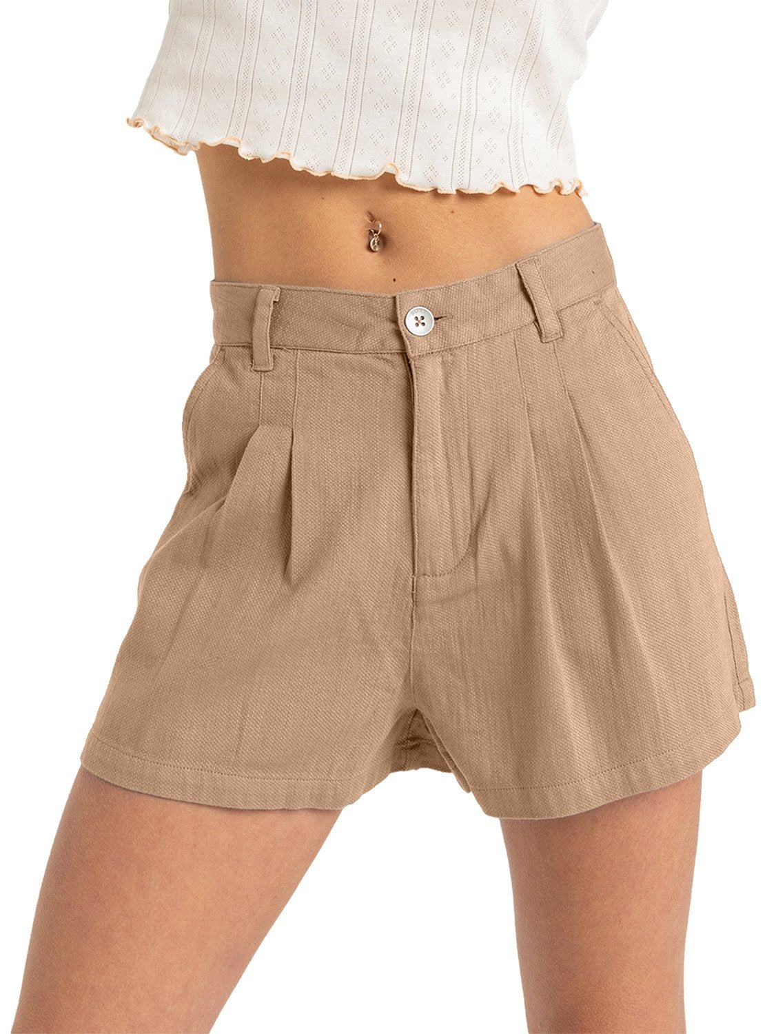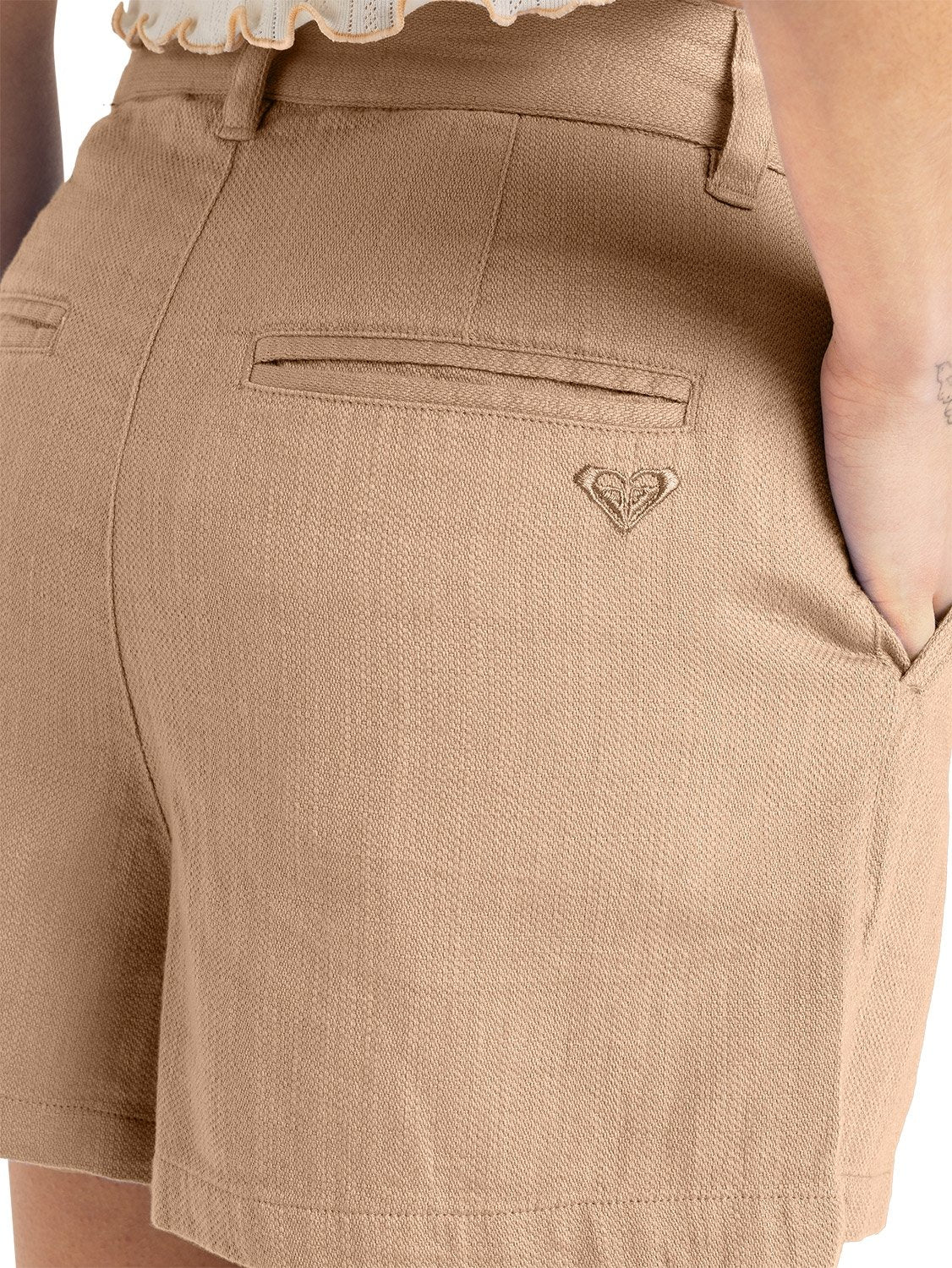Type: Mid rise chino short. Fabric: Mid-weight dobby slub 100% cotton (200g/m2). Fit: Relaxed fit large leg. Fly/Waist: Mid rise. Fixed waistband closed by 1 Roxy metal button. Front zip fly closure. Slash front pockets. Front pleats. Piped pockets at back. Tonal Roxy logo emby at back pocket.