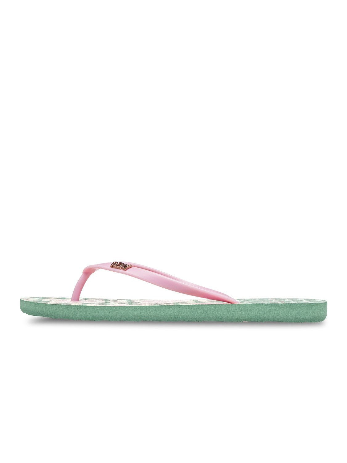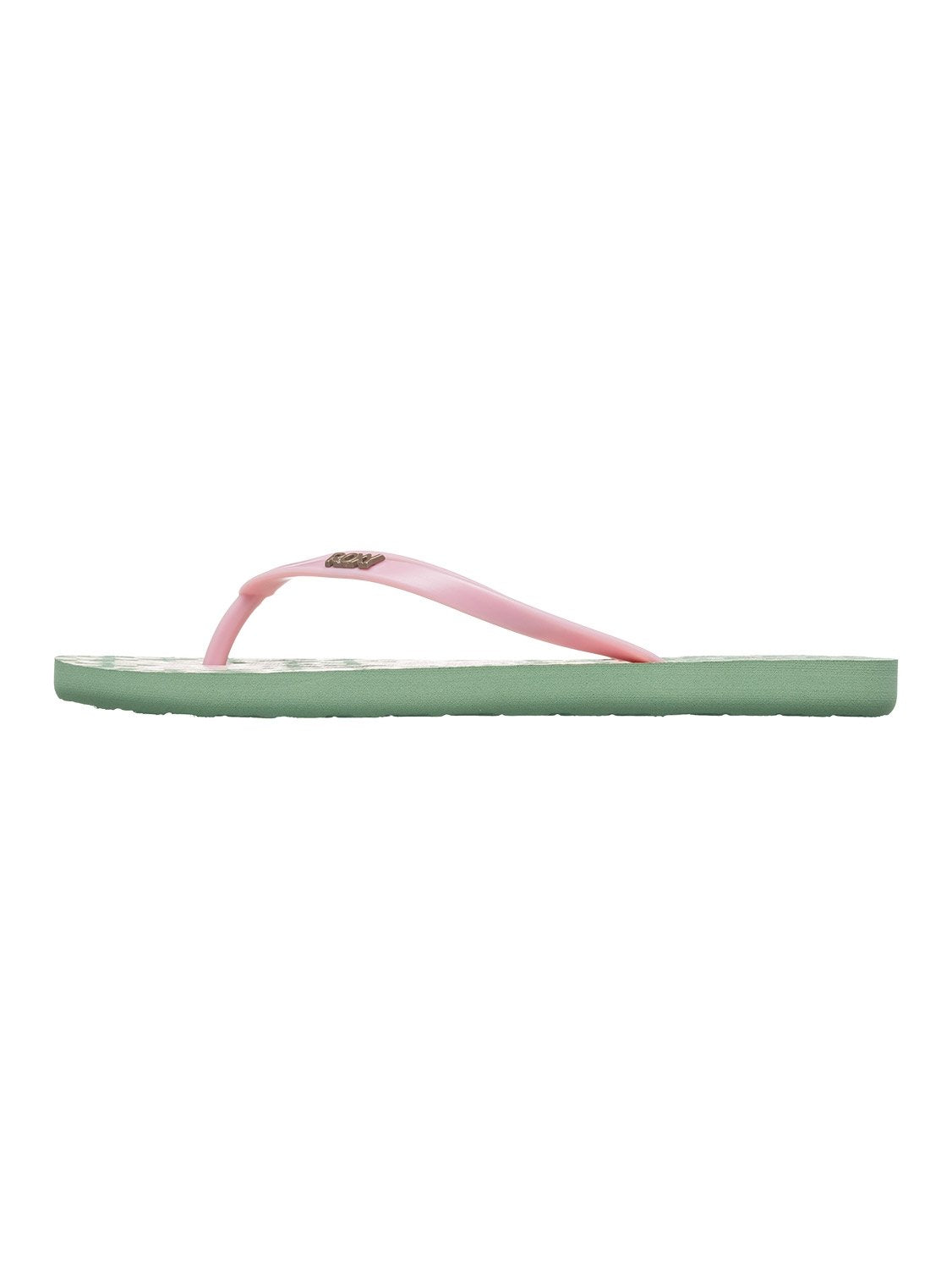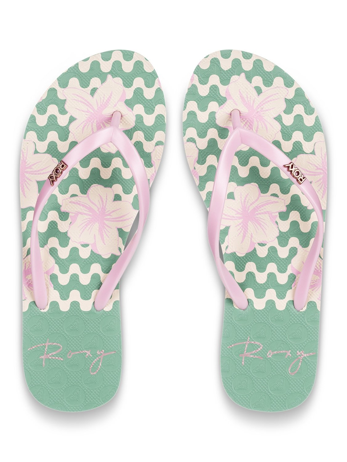 Made with PVC-Free materials. Upper: TR upper straps with metal Roxy pin. Footbed: Recycled rubber sponge EVA footbed; printed with an environmentally friendly ink graphic. Outsole: Recycled rubber sponge EVA with Roxy heritage art. Packaging: Polybag and hanger