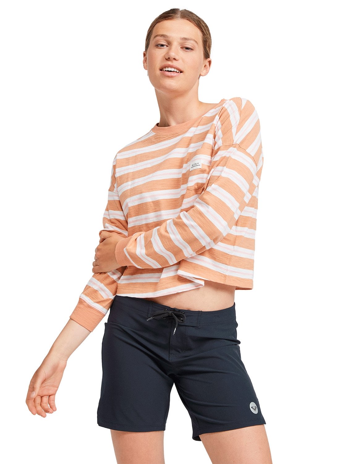 Type: Boardshorts. Fabric: Poplin 90% Recycled Polyester 10% Elastane. New Recycled 4 ways Stretch. Fit/Length: 7 inch boardshort . Waist: flat clean belt. Closure: lace up closure at front (4 button hole eyelets) and an inside hook & loop closure. Reflective screen logo at wearers left leg opening. Roxy logo at each end of drawcord. Small notch at side seam for freedom in movement