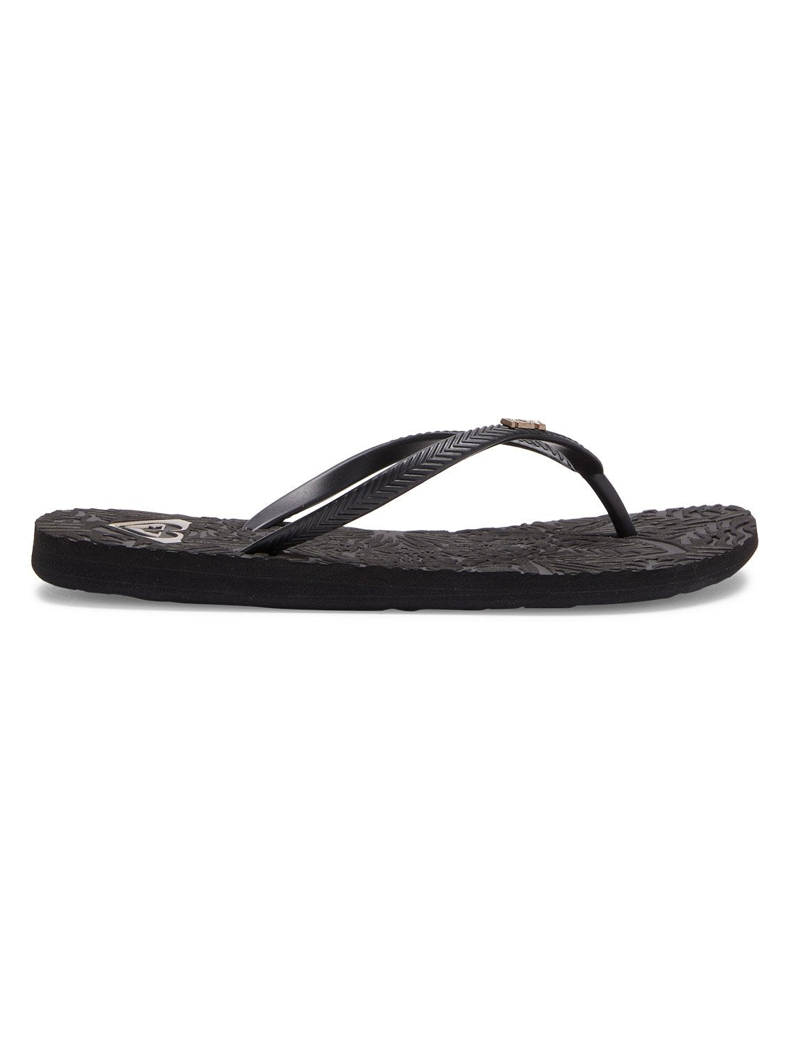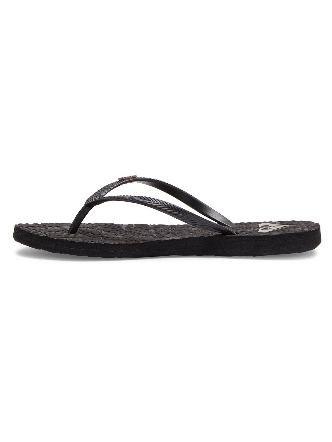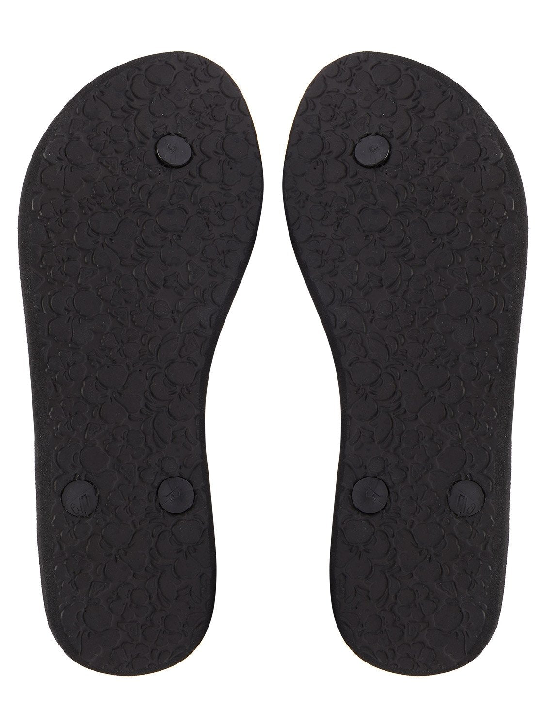 Made with PVC-Free materials. Upper: TR upper straps and with metal logo pin. Footbed: Embossed; recycled rubber sponge EVA footbed printed with an environmentally friendly ink Roxy heart logo. Outsole: Recycled rubber sponge EVA with Roxy heritage art. Packaging: Polybag and hanger