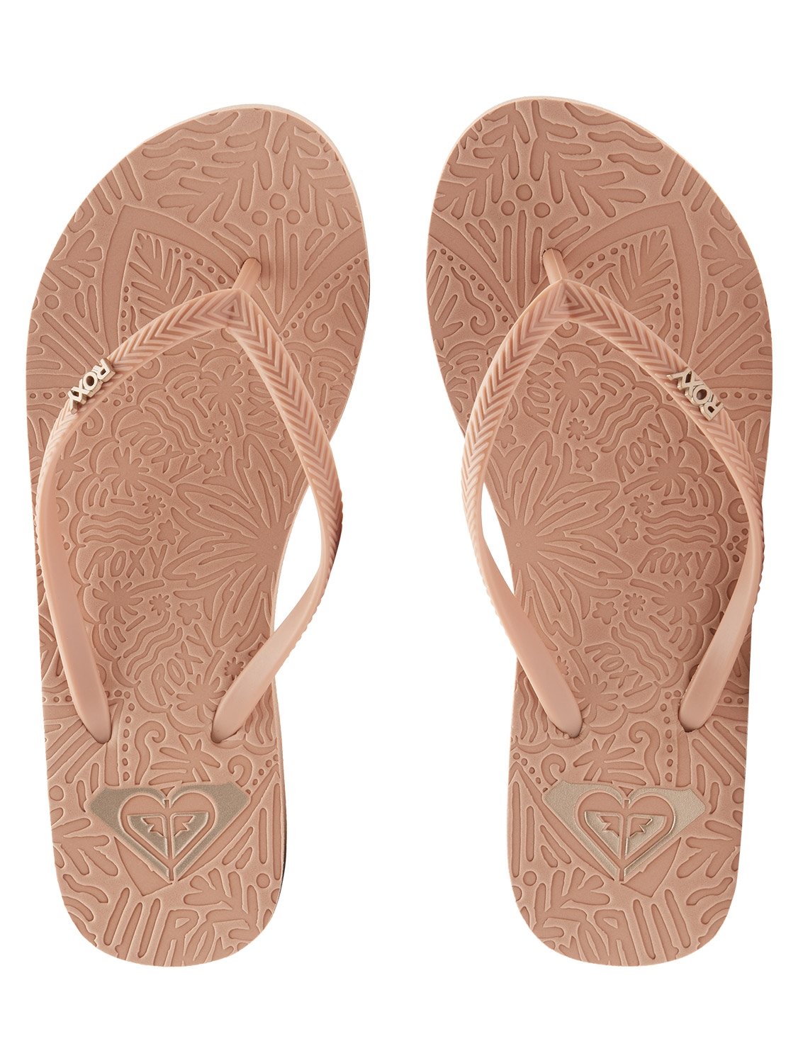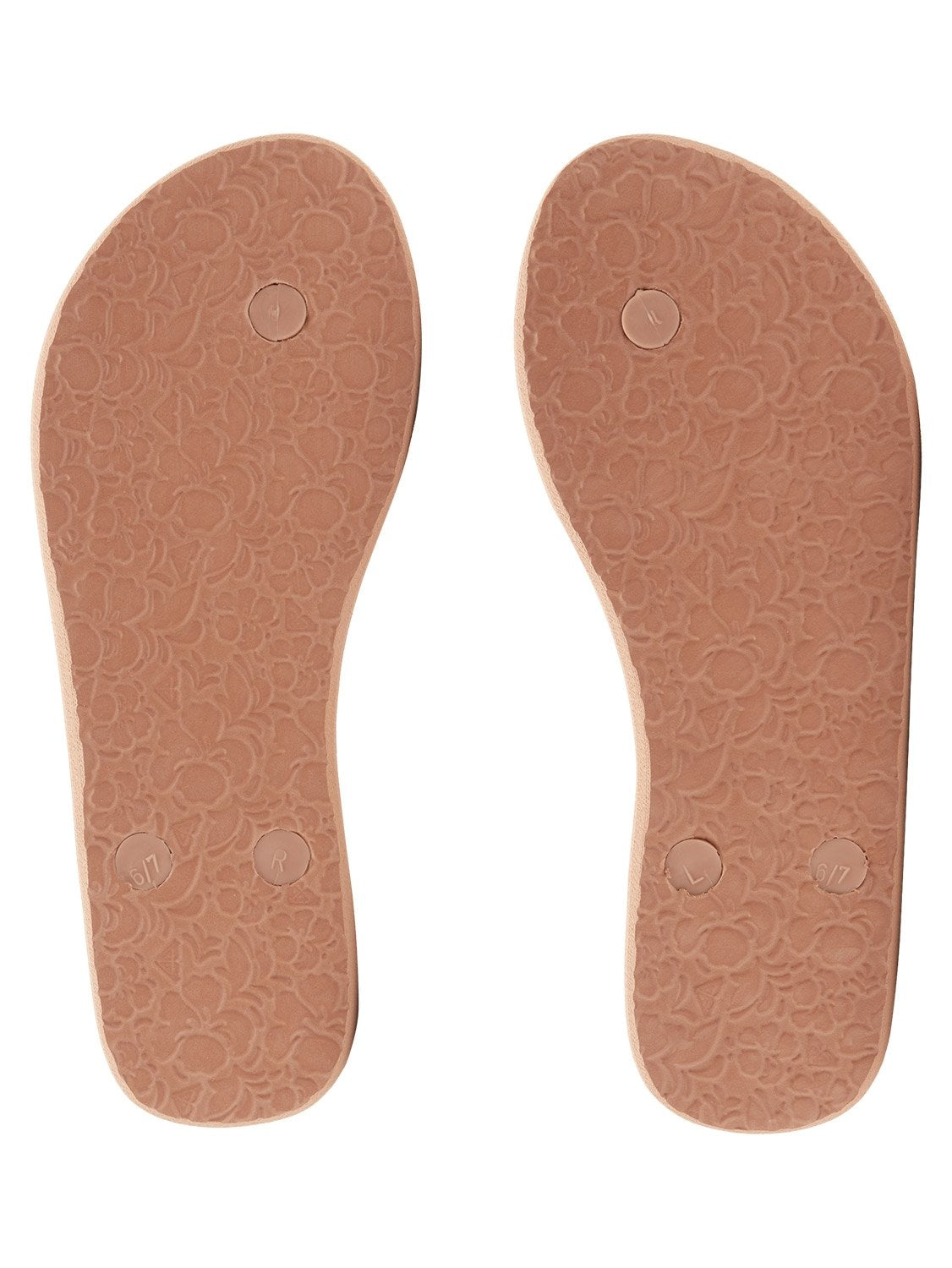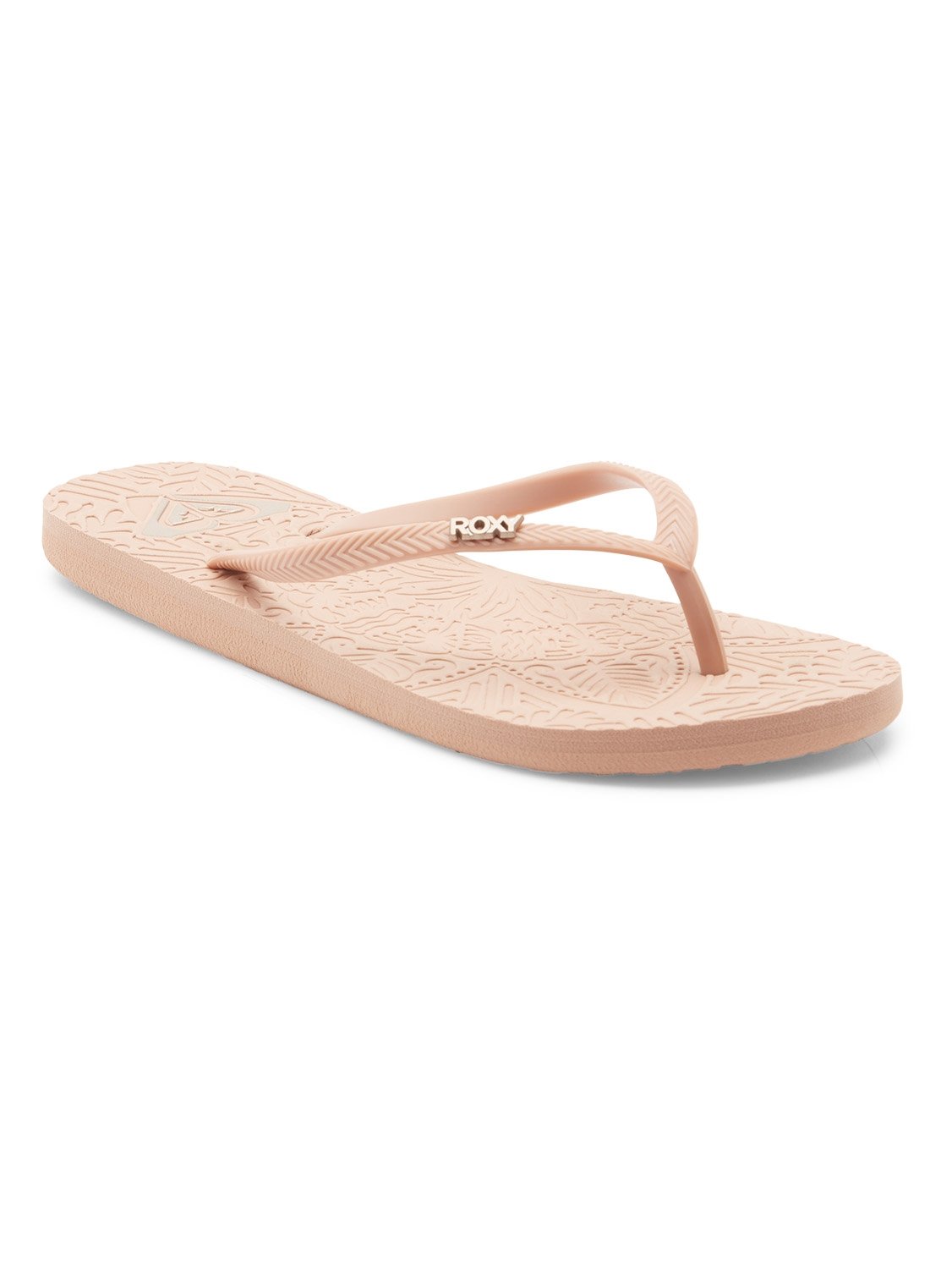 Made with PVC-Free materials. Upper: TR upper straps and with metal logo pin. Footbed: Embossed; recycled rubber sponge EVA footbed printed with an environmentally friendly ink Roxy heart logo. Outsole: Recycled rubber sponge EVA with Roxy heritage art. Packaging: Polybag and hanger