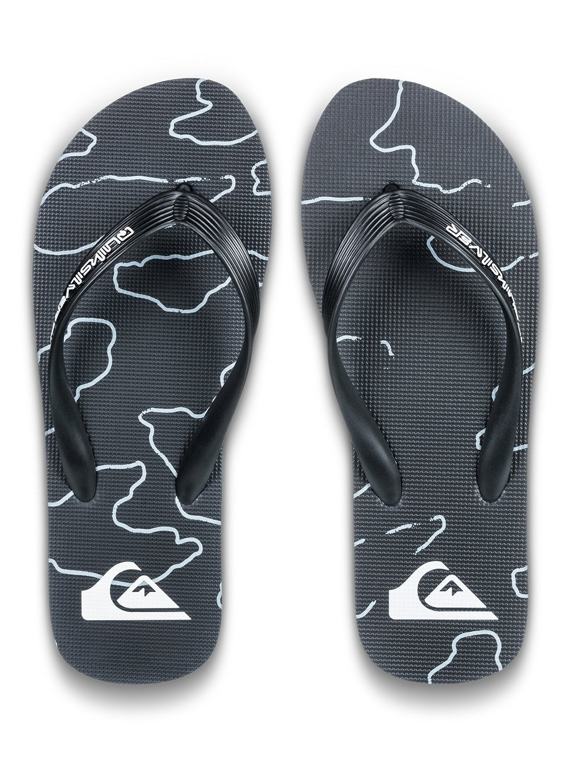 Flexible 3 point synthetic rubber strap with Quiksilver logo and fine mold Mountain Wave logo^Slip resistant textured footbed^Pop color pin lines in sidewall tying into colorway^Engineered blown rubber outsole incorporates multi angled logo lugs for added traction.