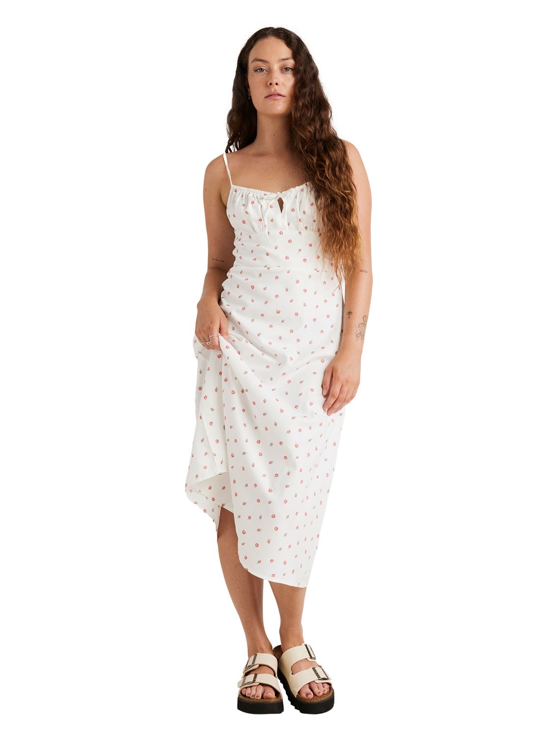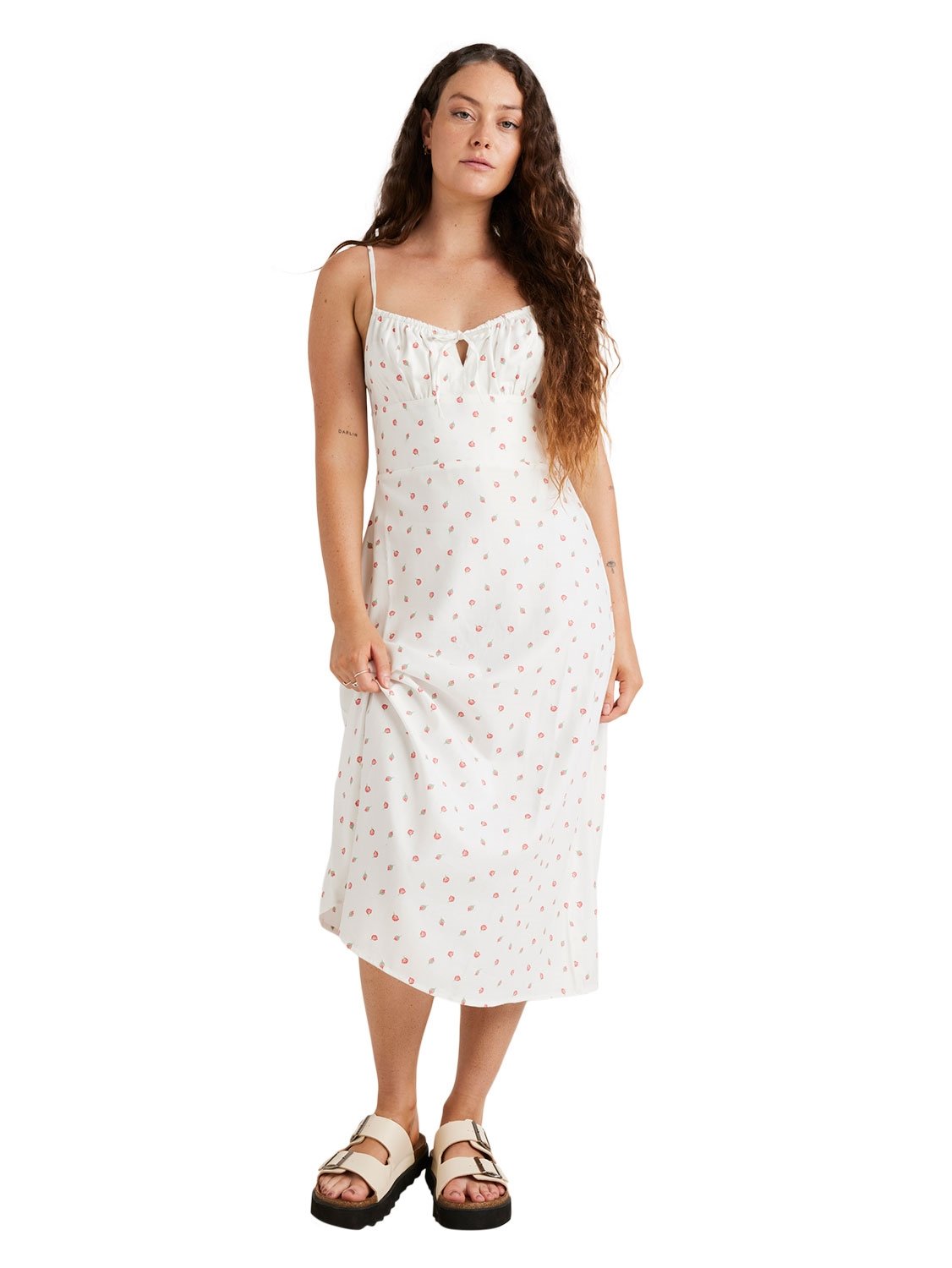 Product Type: Midi Dress. Fabric: Cotton/Modal. Fit: Slim. Sleeves: Sleeveless. Neck: Round Neck. Adjustable straps