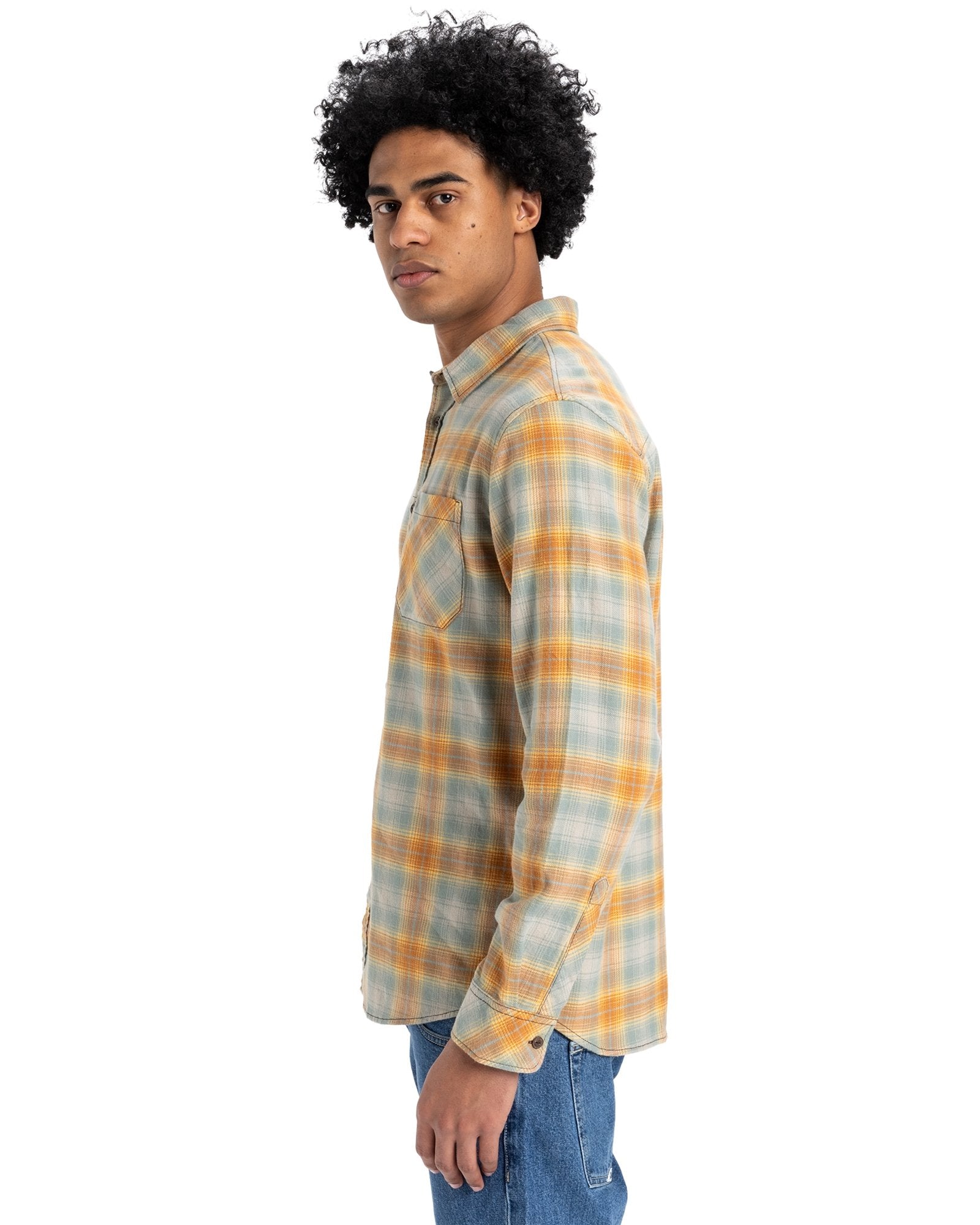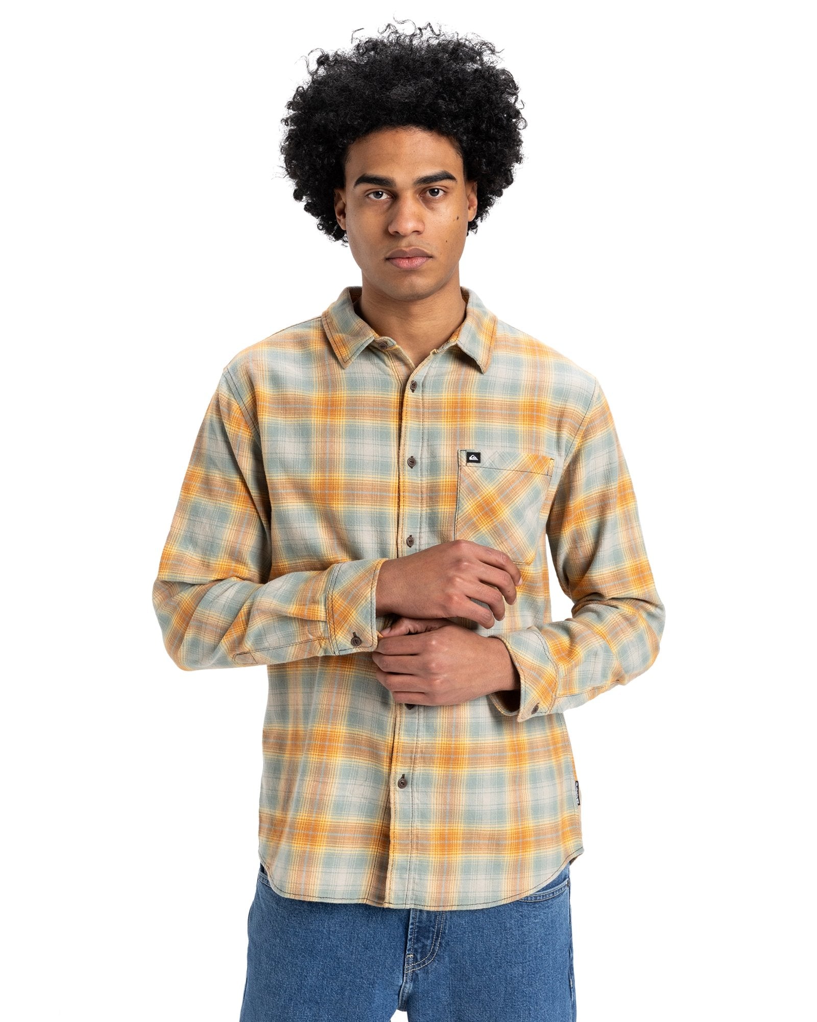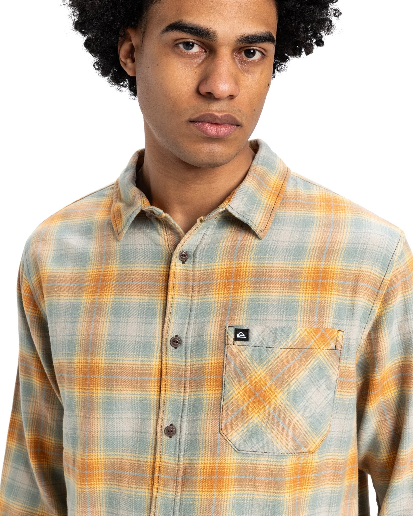 Fabric: 165gm2 Cotton brushed flannel. Fit: Regular. Wash: E-flow wash. Neck: Classic collar. Sleeves: Long sleeves. Pocket:Single chest Pocket. Closure:Button closure. Branding:Quiksilver woven label on chest pocket and at side seam. Scalloped hem